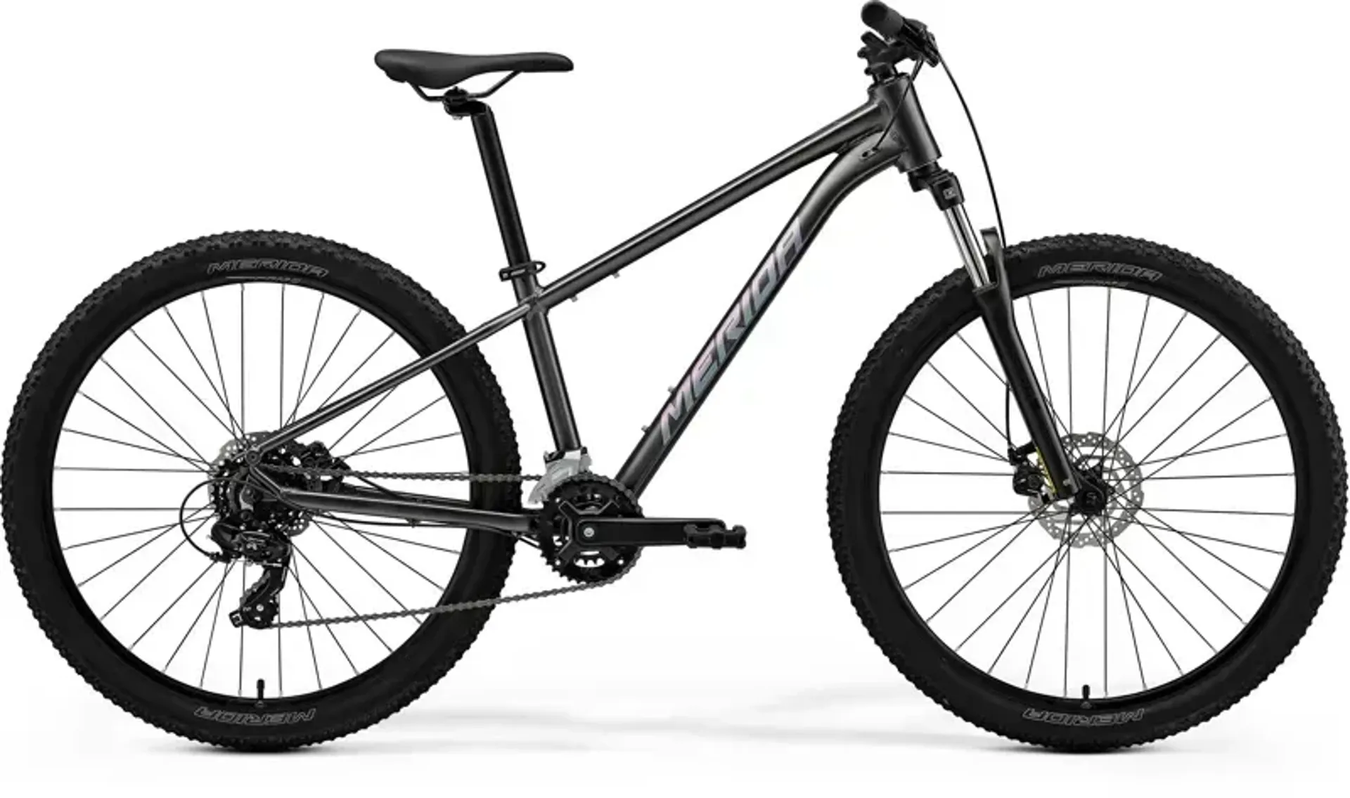 The entry to the world of MERIDA mountain bike hardtails. Their latest high-quality TFS frame takes everything they know about aluminium frame manufacturing, with updated geometry that delivers more on-trail performance without losing all-around versatility. The SR Suntour 100 mm suspension fork is paired with more agile 27.5" wheels smooth the bumps and the Shimano disc brakes and 2x7-speed drivetrain deliver reliable and confident performance.